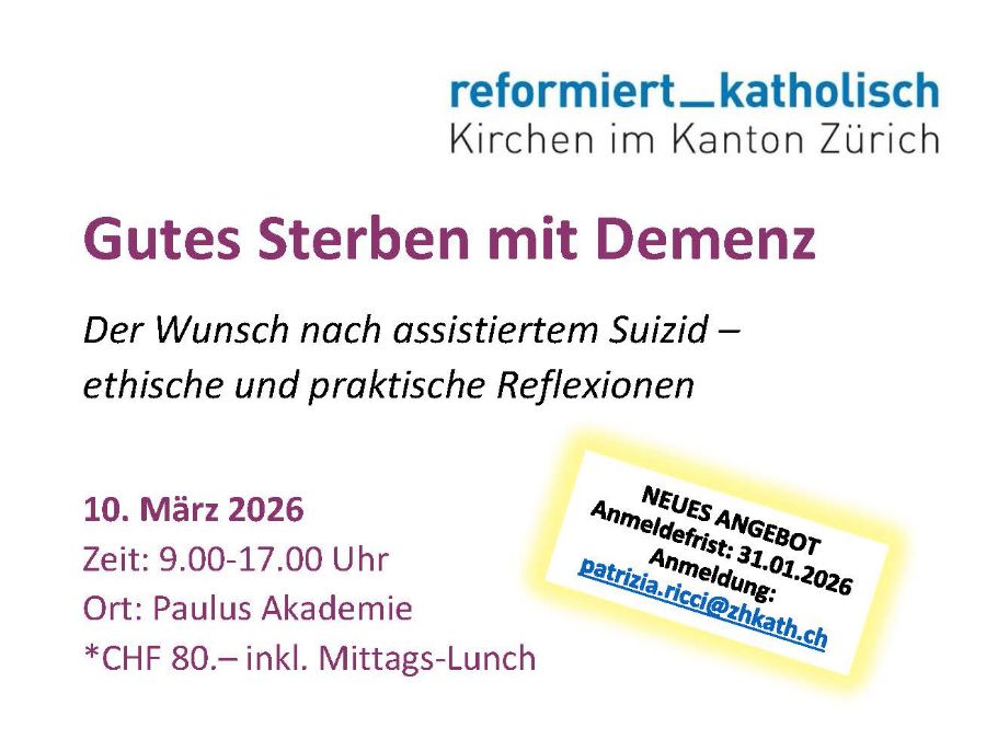Ergänzend dazu stellt Silke Winkler, katholische Spitalseelsorgerin am Stadtspital Zürich Triemli, praxisorientierte Handlungsmöglichkeiten vor. Sie zeigt auf, wie Fachpersonen achtsam mit Sterbewünschen umgehen können, und eröffnet einen Raum für Austausch und Fragen. Für die Veranstaltung können Sie sich bis 31. Januar 2026 per E-Mail an patrizia.ricci@zhkath.ch anmelden.