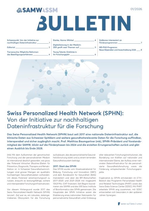 Die SAMW veröffentlicht ihr Bulletin dreimal pro Jahr. Neben einem umfassenden Schwerpunkt enthält es Informationen zu den laufenden Aktivitäten.