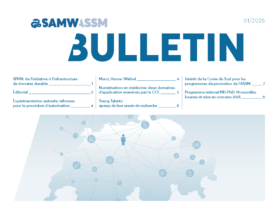 In the Bulletin 1/2026, the Ethics Committee for Animal Experimentation (ECAE) looks back as well – at the commitment of its President, Hanno Würbel – and ahead to possible reforms of the authorisation procedures for animal experiments. You can also read about the topics the Central Ethics Committee (CEC) is addressing in the field of digitalization and how two former Young Talents in Clinical Research experienced their research year. In addition, the issue includes information about a visit from Korea and on the MD-PhD Fellowships Program.