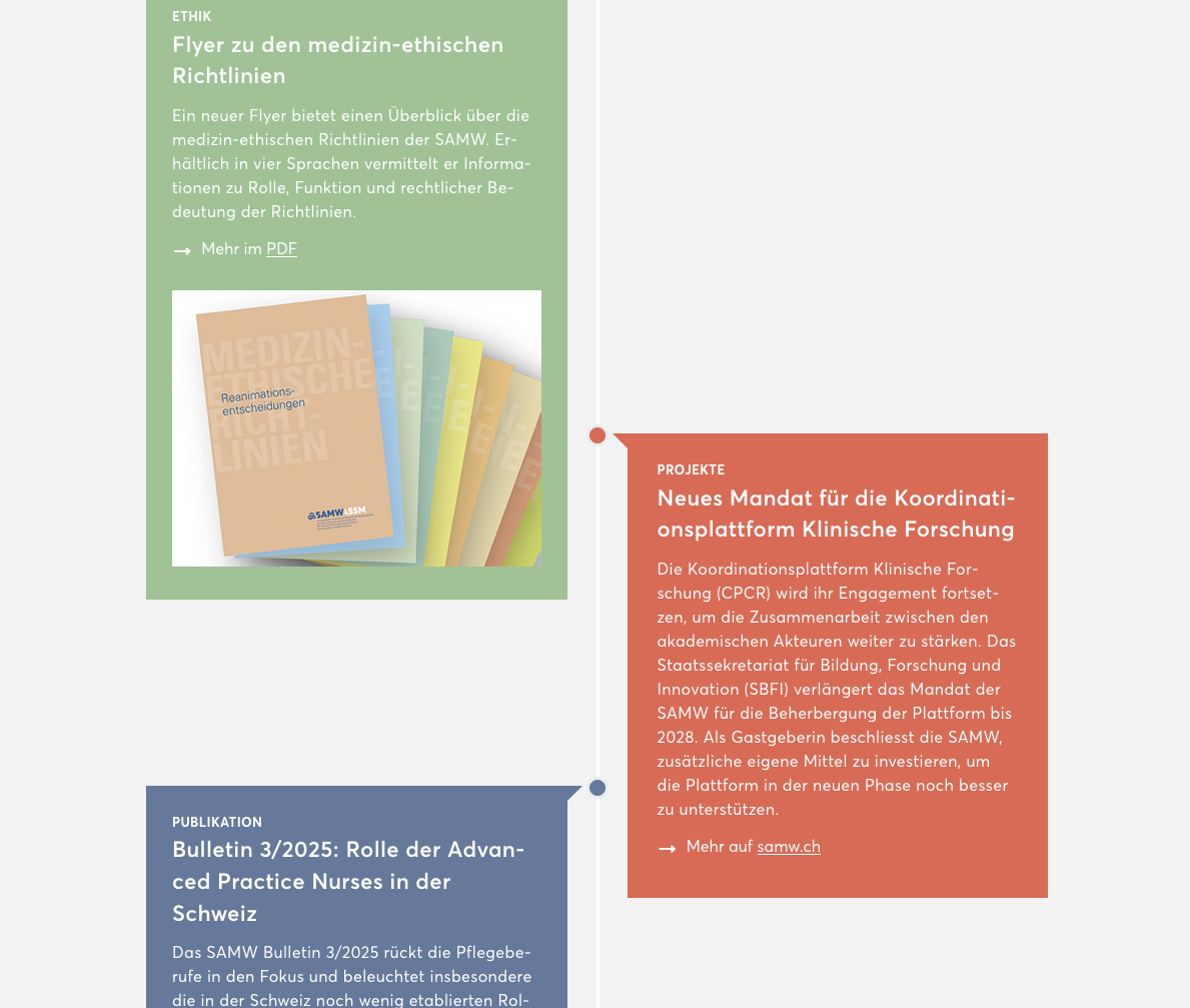 So wurde 2025 der Bericht zur Advanced Nursing Practice (ANP) in der Schweiz veröffentlicht. Die von Prof. Brügger erarbeitete Bestandsaufnahme zeichnet ein Bild der vielfältigen und komplexen Pflegelandschaft und formuliert Empfehlungen zur ANP. Die SAMW bereitet zu diesem wichtigen Thema eine Stellungnahme vor.